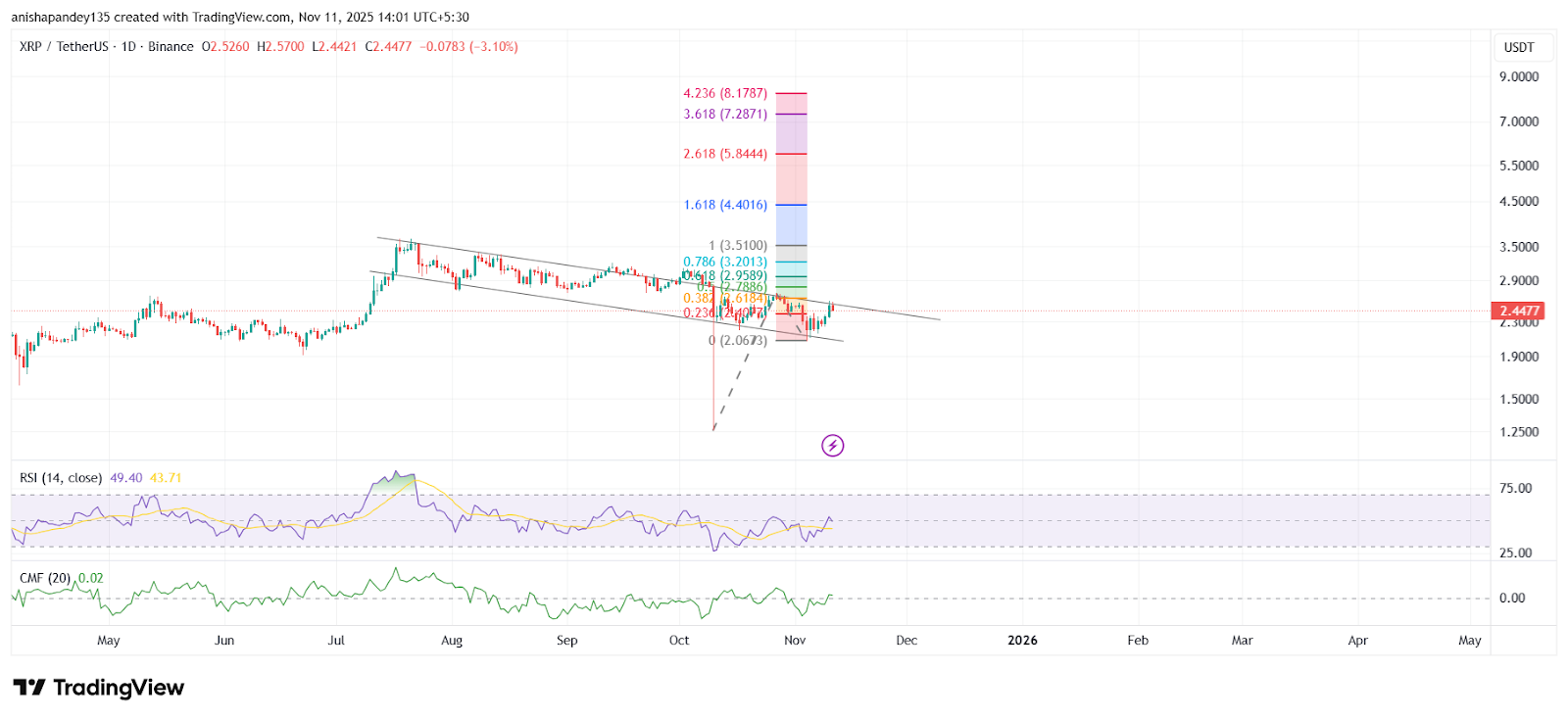 As per the chart below, XRP trades at around $2.45, showing a slight decline of about 2.74%. Immediate resistance levels appear near $2.61 and $2.95, corresponding to the 0.382 and 0.618 retracement levels, while stronger resistance lies around $3.20 and $3.51.