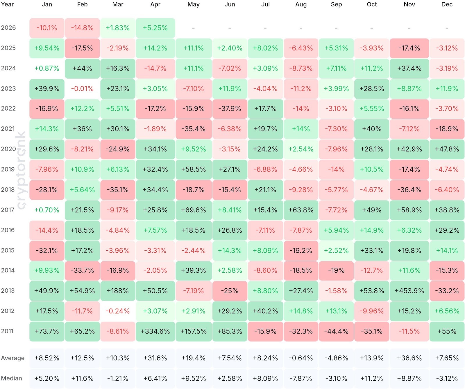 Le Bitcoin se négocie à 71 782 $ aujourd’hui, 8 avril 2026, en forte hausse par rapport à un creux mensuel proche de 65 500 $. La carte de chaleur mensuelle des rendements montre qu’avril enregistre déjà un gain de 5,25 %, proche de sa médiane historique de 6,41 % mais bien en dessous de sa moyenne de 31,6 %. Au cours du dernier jour, le Bitcoin a bondi de près de 5 %.