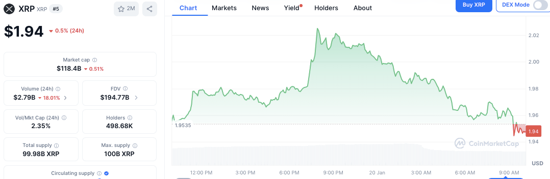 Au moment où j’écris ces lignes, XRP se négocie à 1,94 $, en baisse de 0,5 % sur 24 heures. La capitalisation boursière s’est élevée à 118,4 milliards de dollars, tandis que le volume des échanges sur 24 heures a diminué de 18,01 % pour atteindre 2,79 milliards de dollars, suggérant une participation à court terme réduite après la tentative ratée au-dessus de 2,00 dollars.