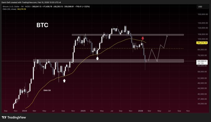 Les experts affirment La prochaine étape du Bitcoin dépend fortement de sa capacité à maintenir la zone de prix 69 000 à 72 000 dollars, qui agit désormais comme une zone de soutien clé. Plus tôt, la cryptomonnaie avait perdu un niveau de support technique majeur autour de 98 000 à 100 000 $, et un rebond raté a confirmé la tendance vers un élan plus faible.