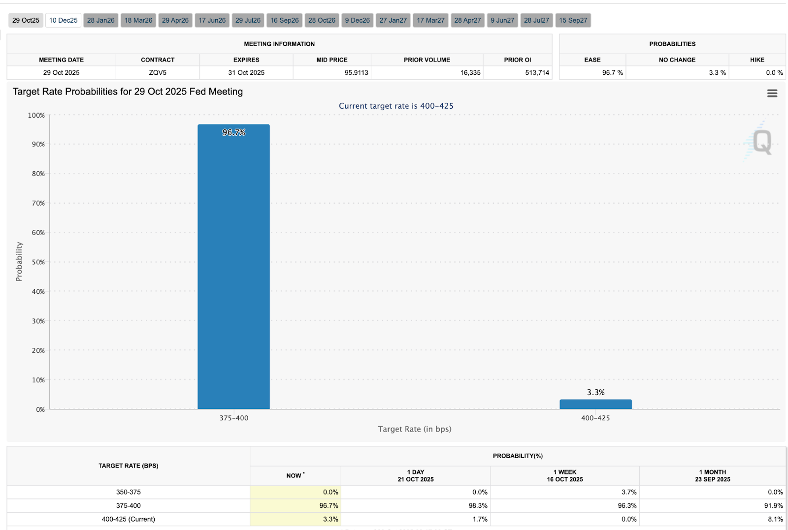 Selon les analystes, l’IPC revêt une importance inhabituelle ce mois-ci, car il s’agit du seul indicateur d’inflation majeur disponible avant la réunion de politique monétaire de la Fed. Selon l’outil FedWatch du CME, les marchés à terme montrent une probabilité de 96 % d’une baisse des taux en octobre et de 85 % une probabilité d’une autre en décembre.