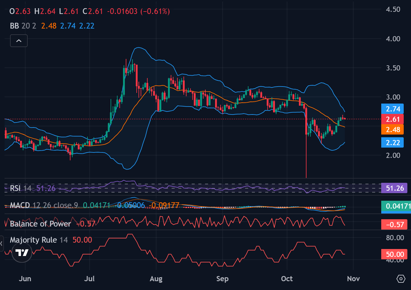 Le RSI s’établit à 51,26 tandis que le MACD montre un léger croisement haussier, l’histogramme étant à peine en territoire positif. Cependant, la BoP indique que les vendeurs détiennent toujours un léger avantage et que XRP doit dépasser 2,75 $ pour confirmer un retournement haussier.