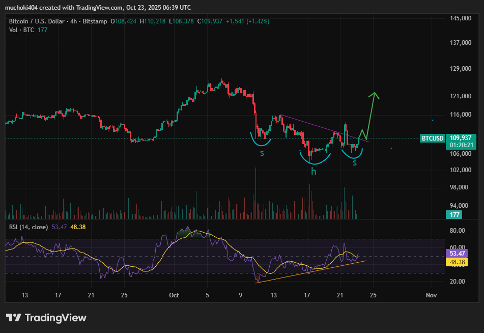 Au cours de la période de quatre heures, la paire BTC/USD a formé un modèle de retournement potentiel. Depuis sa capitulation du 11 octobre, la paire BTC/USD a formé une possible configuration inverse de la tête et des épaules, associée à une divergence haussière de l’indice de force relative (RSI).