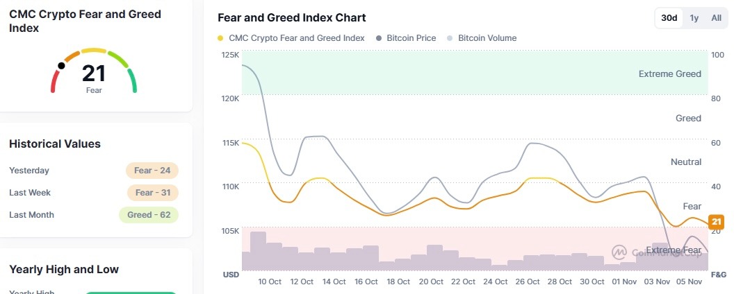 L’indice Fear & Greed de CoinMarketCap a chuté à son plus bas niveau en 30 jours, près de 21/100, un niveau que les traders interprètent habituellement comme un « risque de capitulation », mais le flux de transactions est resté solide. Cela nous indique que l’argent intelligent achète les infrastructures futures alors que les prix au comptant correctent.