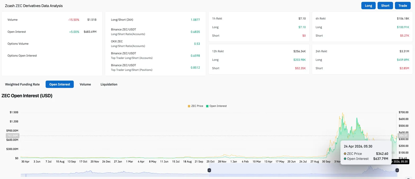 - ZEC se négocie à 356,15 $, en baisse de 0,94 %, maintenant le Fib 0,382 à 326,04 $, le MACD devenant haussier et l’OI en hausse de 5 %.