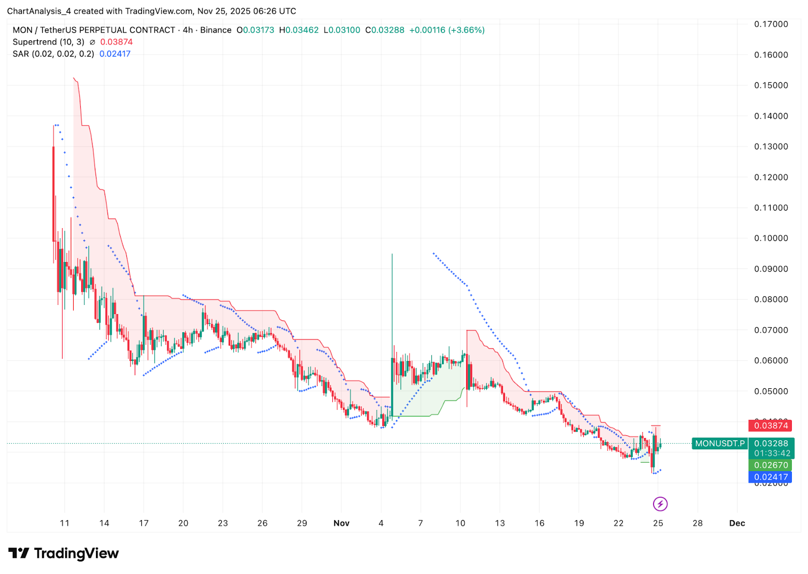 - MON se négocie près de 0,033 alors que les marchés absorbent l’impact de son offre de 100 milliards de tokens.
