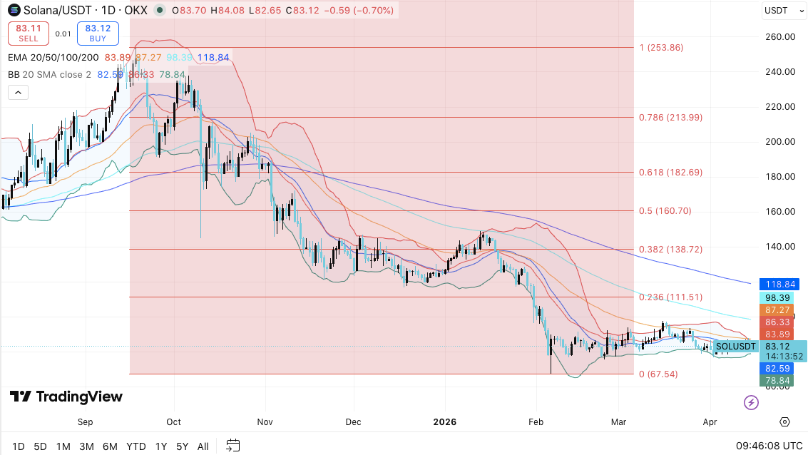SOL maintient une tendance baissière claire, marquée par des sommets et des creux plus bas constants. De plus, les rejets répétés proches d’une résistance descendante renforcent la force des vendeurs au cours des dernières séances. Le prix reste en dessous de toutes les grandes moyennes mobiles exponentielles, ce qui continue de signaler un biais baissier plus large.