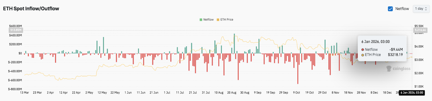 Cependant, des pics d’entrée intermittents coïncidaient avec des reprises de prix, indiquant une accumulation sélective lors des reculs. De plus, les sessions récentes ont montré des flux nets légèrement négatifs, ce qui suggère une retenue plutôt qu’un achat agressif près de 3 200 $.