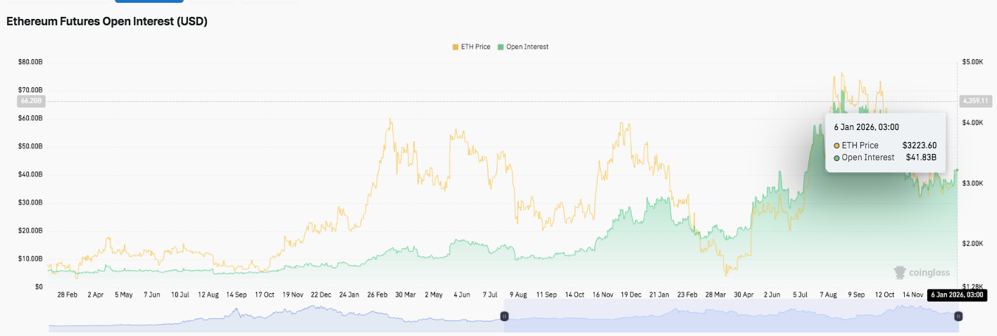 L’intérêt ouvert sur les contrats à terme sur Ethereum s’est développé régulièrement pendant une grande partie de 2025, reflétant une participation croissante aux dérivés parallèlement à la hausse des prix. De manière significative, l’intérêt ouvert a atteint un pic au-dessus de 60 milliards de dollars lors des rebondissements de fin 2025 avant de se refroidir à près de 42 milliards de dollars.