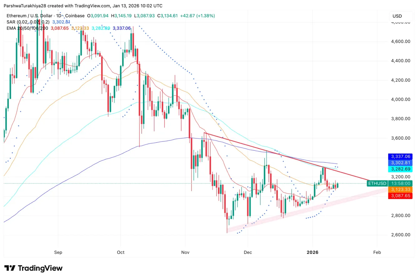 La combinaison de la participation de 4 milliards de dollars de Bitmine, de l’amélioration de l’adoption institutionnelle et des flux au comptant positifs positifs crée un fond fondamental optimiste. Si l’ETH dépasse 3 200 $ et récupère le SAR parabolique à 3 302 $, la cassure du triangle confirme et vise initialement 3 500 $ avec un potentiel supplémentaire vers 3 800 $ si l’élan augmente.