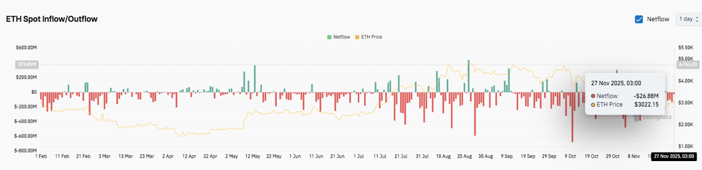Les dernières lectures autour du 27 novembre ont montré l’un des niveaux d’intérêt ouvert les plus élevés de 2025. Cela s’est produit avec Ethereum se négociant près de 3 026 $. Cette hausse correspond également aux attentes de catalyseurs plus forts dans les semaines à venir.