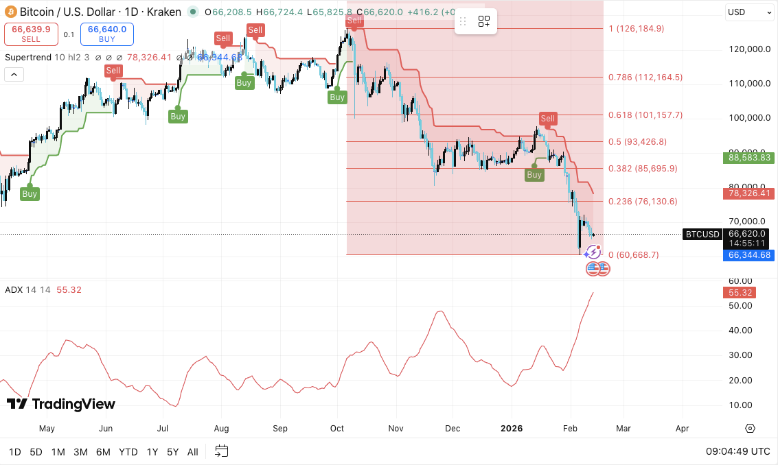 De plus, le prix reste en dessous de la résistance dynamique indiquée par l’indicateur Supertendance. L’élan reste solide, avec un ADX au-dessus de 55, montrant une forte force de tendance soutenue plutôt qu’une indécision du marché.