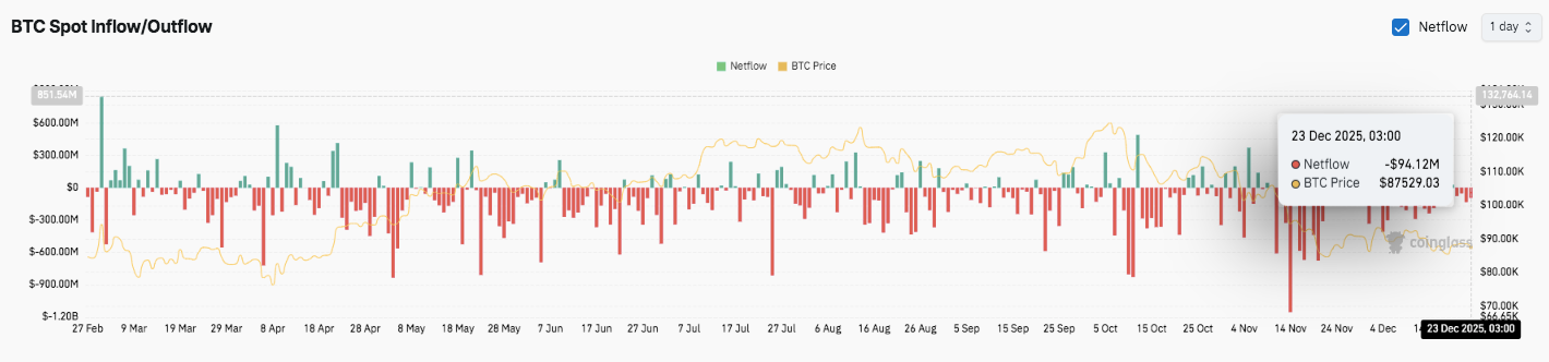 Les flux de marché au comptant dressent cependant un tableau plus défensif. Les sorties continuent de dépasser les entrées sur la plupart des sessions, signalant une distribution continue. De plus, des pics marqués de sorties coïncident souvent avec des reculs locaux des prix. Les récentes sorties nettes proches de 94 millions de dollars renforcent la demande de points faibles alors que le BTC se négocie sous les 88 000 dollars.