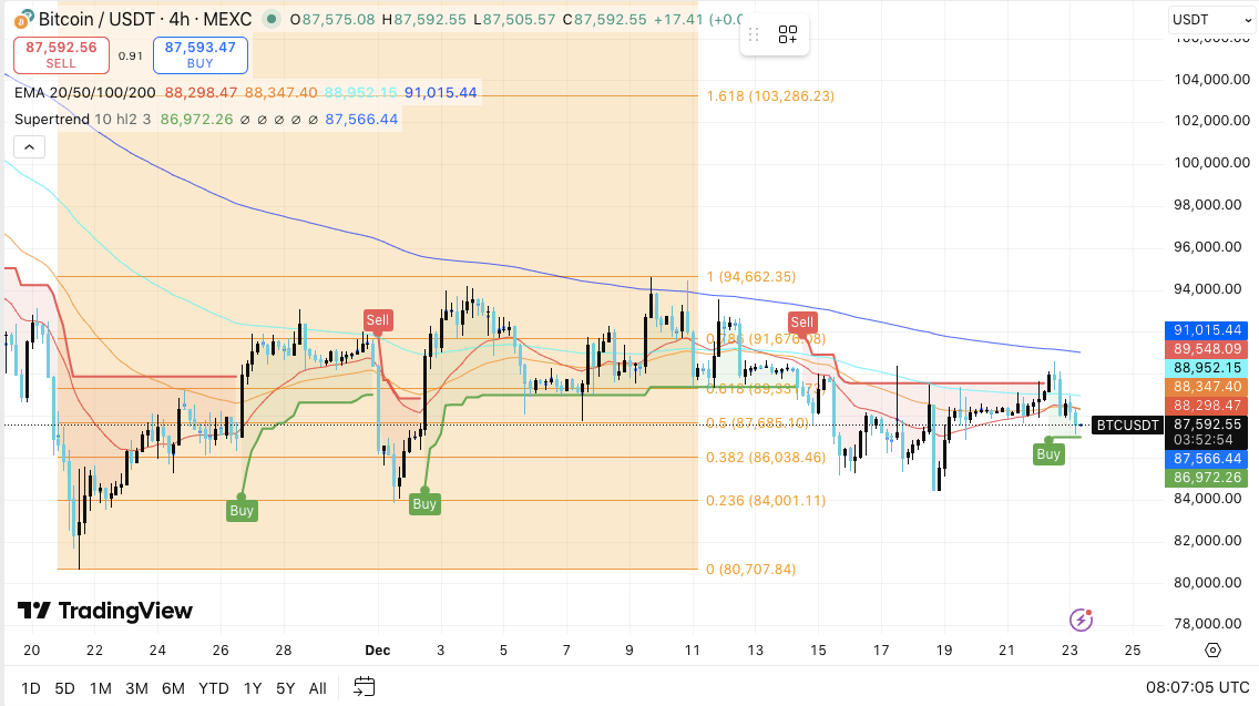 La structure technique du Bitcoin reste bien définie alors que les prix se consolident sous la résistance majeure des tendances. Sur le graphique des 4 heures, le BTC se négocie près de 87 600 $, se concentrant entre la reprise de la dynamique et une pression corrective plus large. Cette configuration suggère qu’un mouvement décisif pourrait approcher à mesure que la volatilité se resserre.