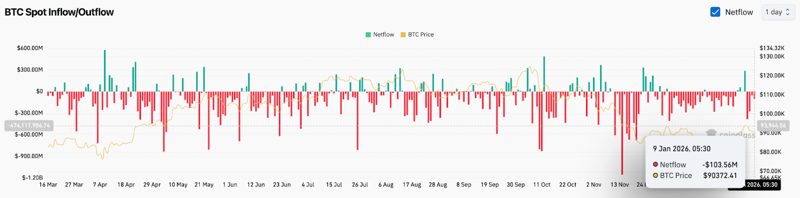 Les données de la bourse au comptant montrent un schéma similaire. Le Bitcoin a enregistré une sortie nette au comptant d’environ 103,6 millions de dollars le 9 janvier, alors que les pièces se sont déplacées sur les plateformes lors des périodes de faiblesse des prix. Ce comportement reflète généralement la distribution, pas l’accumulation.