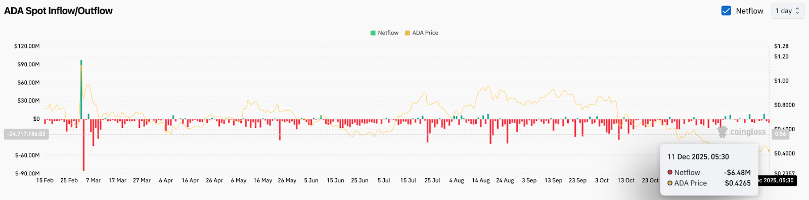 Les données de Coinglass montrent que l’ADA a enregistré près de 6,48 millions de dollars de sorties nettes le 11 décembre. La tendance est restée constante toute la semaine écoulée, avec des affichages rouges répétés dominant le tableau. Cela indique que la liquidité quitte le marché plutôt que de se transformer en accumulation.
