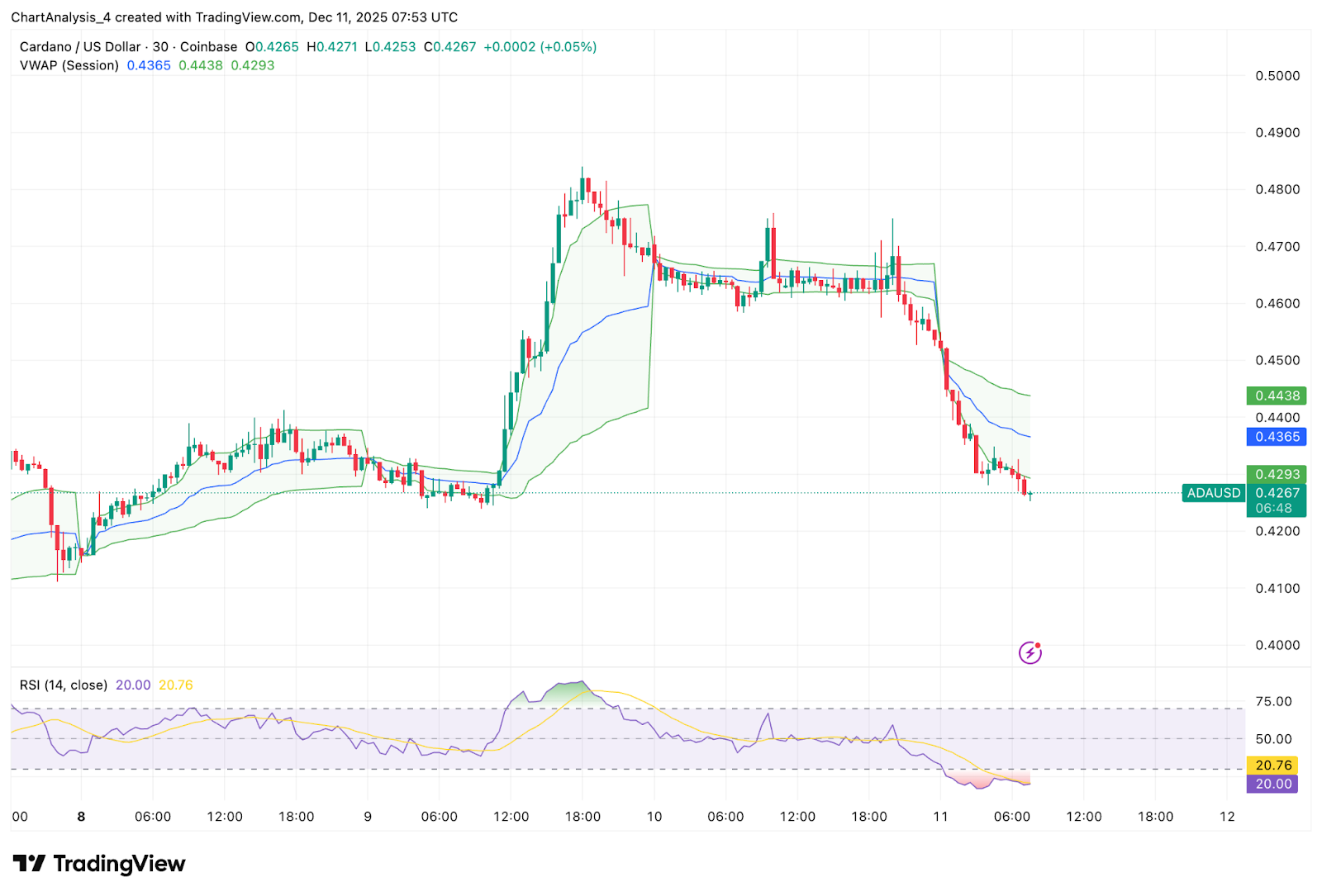 Sur le graphique à 30 minutes, l’ADA reste en dessous du VWAP et se négocie près du bas du canal Keltner. Le RSI est proche de 20, montrant des conditions de survente mais pas encore de renversement clair. Les acheteurs ont tenté de petits rebonds proches de 0,43 $, mais aucun n’a récupéré le VWAP ni la première zone d’approvisionnement à 0,4400 $.