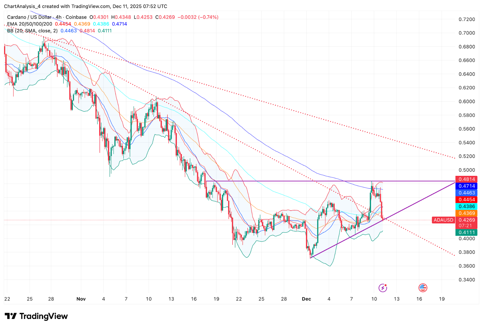 Le prix du Cardano se négocie aujourd’hui près de 0,426 $ après être passé sous une ligne de tendance à court terme qui soutient la reprise depuis début décembre. Cette mesure intervient alors que les sorties au comptant montent à nouveau et que l’intérêt d’ouverture des contrats à terme chute de plus de 11 %, signalant une pression sur les acheteurs alors que l’ADA peine à se maintenir au-dessus des 20 et 50 EMA sur le graphique des quatre heures.