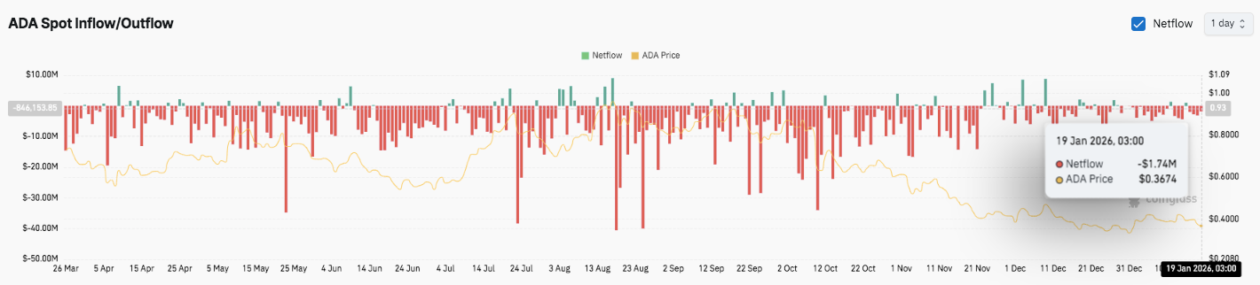 La première zone de support se situe entre 0,364 $ et 0,355 $, ce qui correspond à la région de rupture et aux marqueurs clés de Fibonacci. Si cette zone échoue, l’ADA pourrait glisser vers la prochaine base majeure entre 0,328 $ et 0,330 $. Ce niveau reflète un creux antérieur et une zone de demande plus forte. Ainsi, les traders considèrent désormais 0,355 $ et 0,330 $ comme des points de contrôle importants à la baisse.