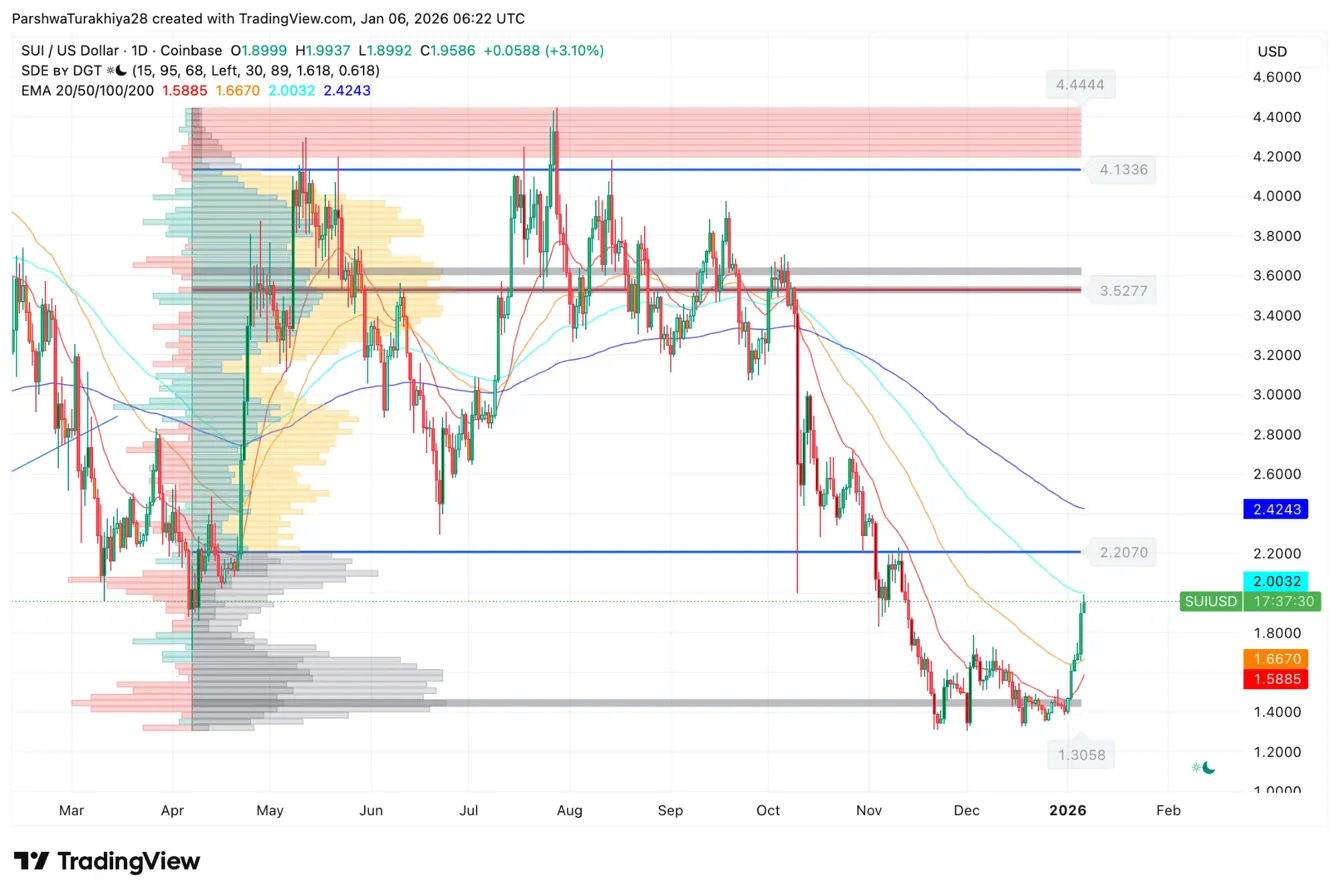 Sui se négocie à 1,96 $ en 2026 apporte par défaut une confidentialité au niveau protocolaire, une allocation de 441 millions de dollars en trésorerie d’entreprise par Mill City Ventures, cotée au Nasdaq, des dépôts d’ETF au comptant de Bitwise et Canary Capital, et une valeur totale de 2,11 milliards de dollars bloquée après une croissance trimestrielle de 19,9 %.