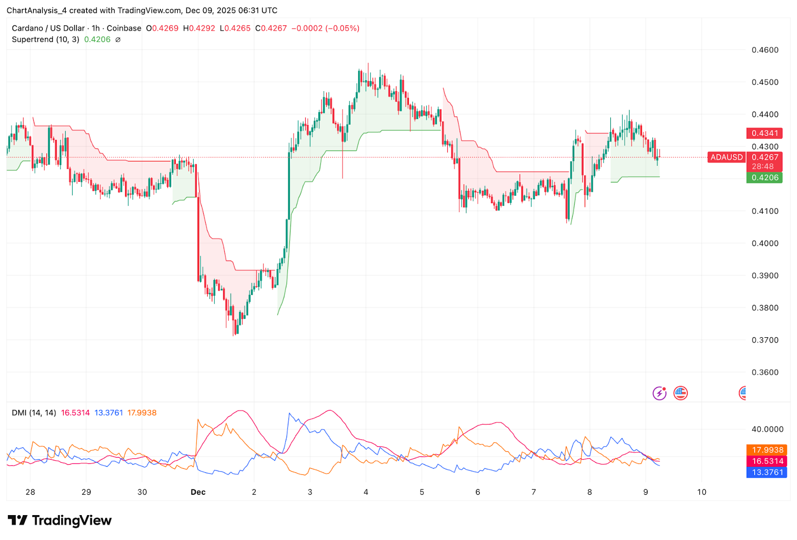 Sur le graphique d’une heure, l’ADA est revenue dans la zone de flip Supertrend à 0,4206 $, ce qui sert désormais de soutien à court terme. Les acheteurs ont poussé le prix vers 0,434 $, mais l’élan s’est arrêté à mesure que la tendance et le rejet de la marche immobilière se sont combinés.