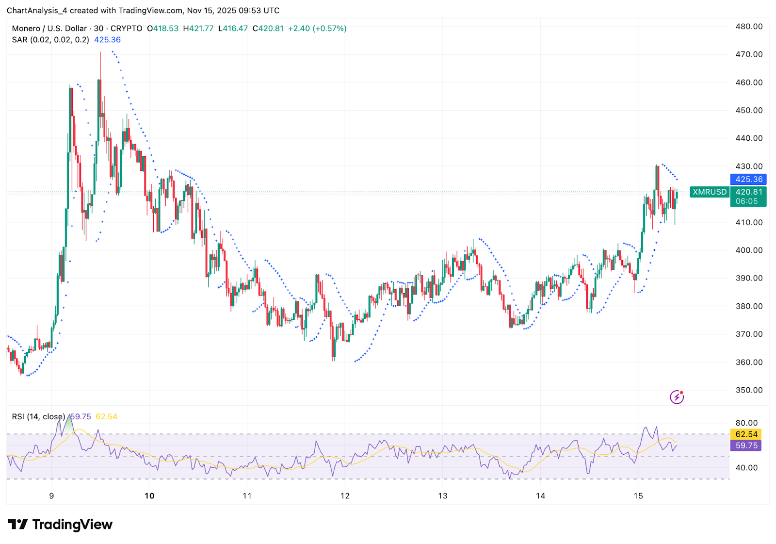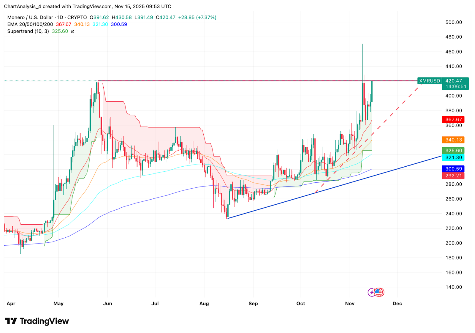 Le prix de Monero se négocie aujourd’hui à près de 420 $, prolongeant une forte reprise après que les acheteurs ont forcé une rupture de la ligne de tendance haussière qui a guidé la structure depuis début septembre.