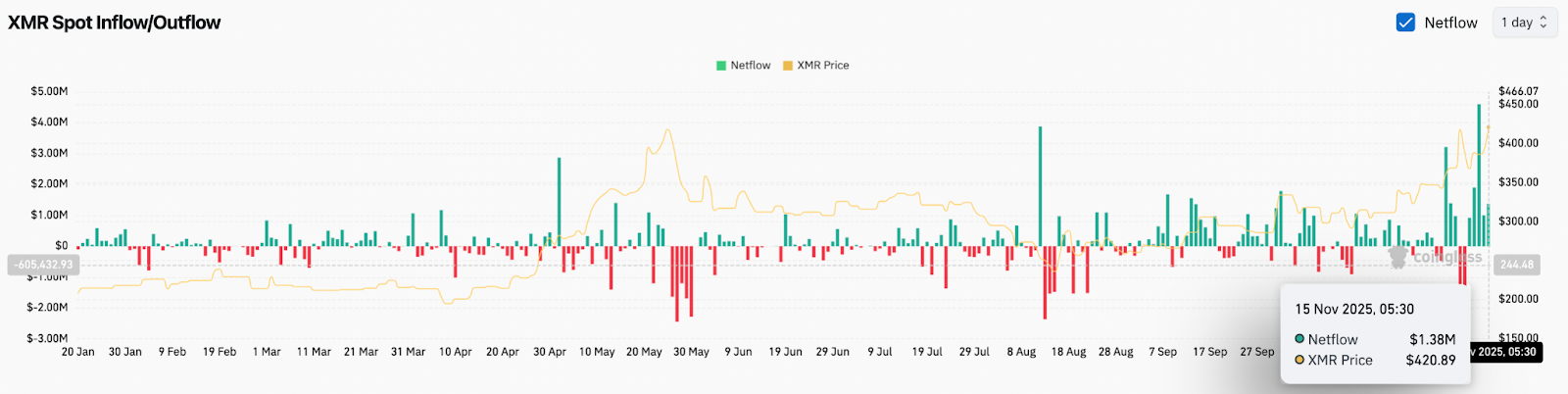 Le profil de flux de XMR a considérablement changé au cours de la semaine écoulée. Les données de Coinglass montrent des impressions vertes constantes, la séance du 15 novembre enregistrant 1,38 million de dollars d’afflux, la plus grande accumulation en une journée depuis plus d’un mois.