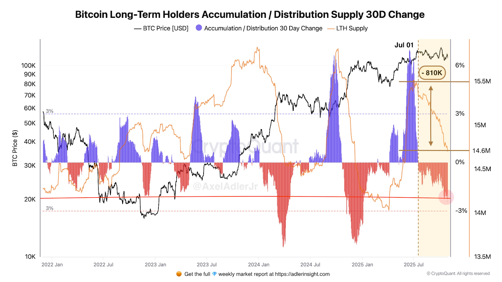 Adler a souligné que les LTH se vendent activement depuis le 1er juillet. Le volume total de distribution de cette cohorte a maintenant atteint 810 000 BTC. Au cours de la même période, leurs avoirs combinés sont passés de 15,5 millions à 14,6 millions de BTC.