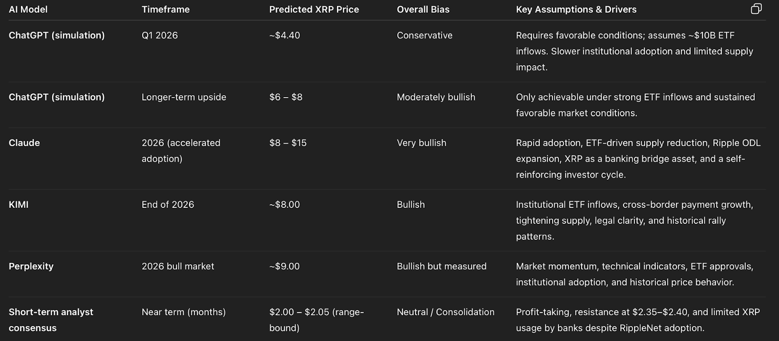 Claude, KIMI, and Perplexity AI are more bullish. Claude predicts XRP could reach $8 to $15 if adoption accelerates and ETFs reduce supply. It emphasizes Ripple’s On-Demand Liquidity network and potential for XRP to serve as a bridge asset for banks.