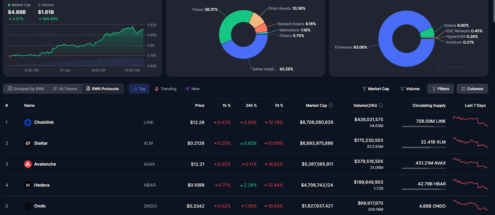 - RWA on-chain value rose 5% to $21.35B in early 2026, signaling renewed growth.