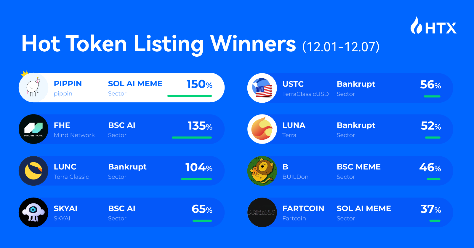 Panama City, December 11, 2025 – From December 1 to December 7, market sentiment on HTX turned sharply higher, driven by a combination of macro volatility and renewed risk appetite. A wave of high-beta assets on this global leading exchange posted outsized gains, with Solana- and BSC-based AI meme coins leading a broad rebound. PIPPIN, FHE, and other high-volatility names significantly outperformed with a dead-cat bounce, while long-dormant “bankrupt” assets saw a surprise rotation amid renewed discussion around Terraform founder Do Kwon. Below is a recap of the week’s standout performers on HTX.