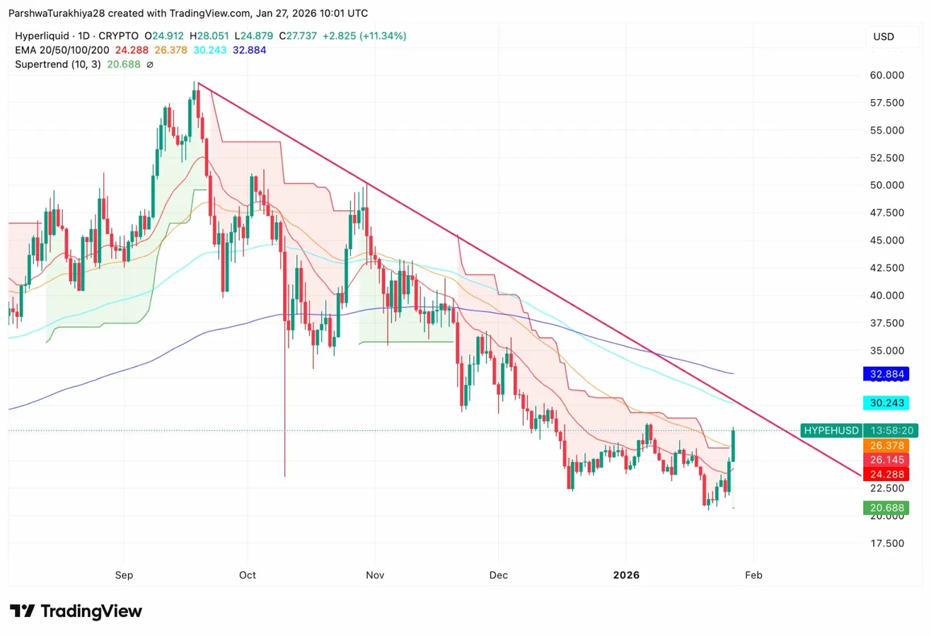 - Hyperliquid surges 11.34% to $27.737, testing the descending trendline that has capped price since September highs near $58.