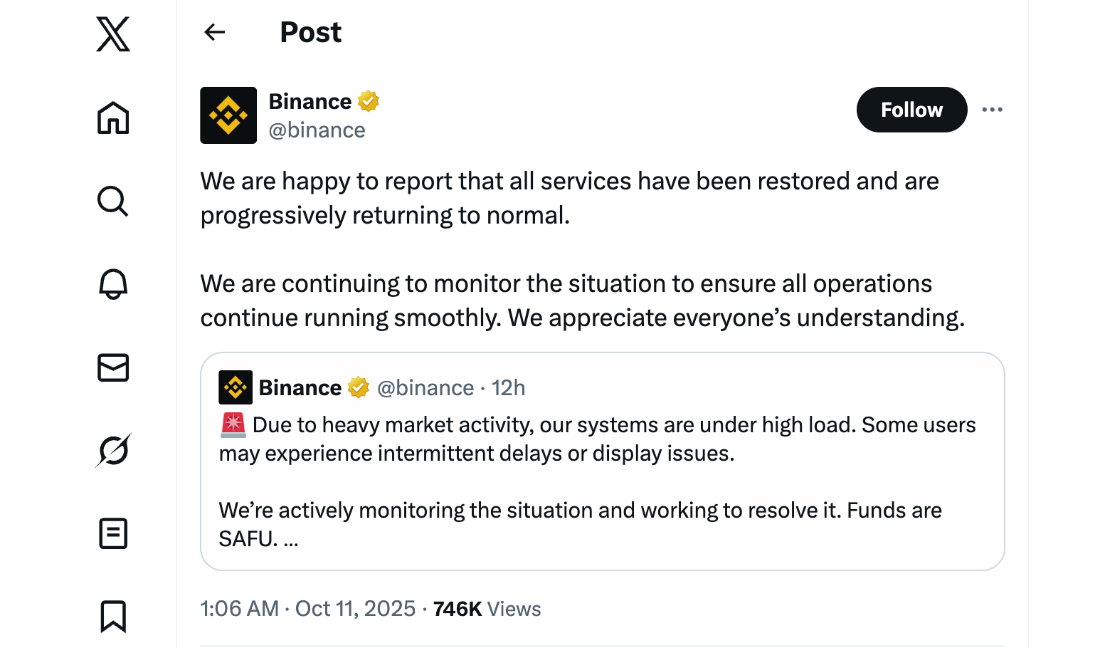 Binance confirmed “heavy load” conditions, causing delays and display problems. However, they assured users that funds were safe and the team was watching the situation closely.