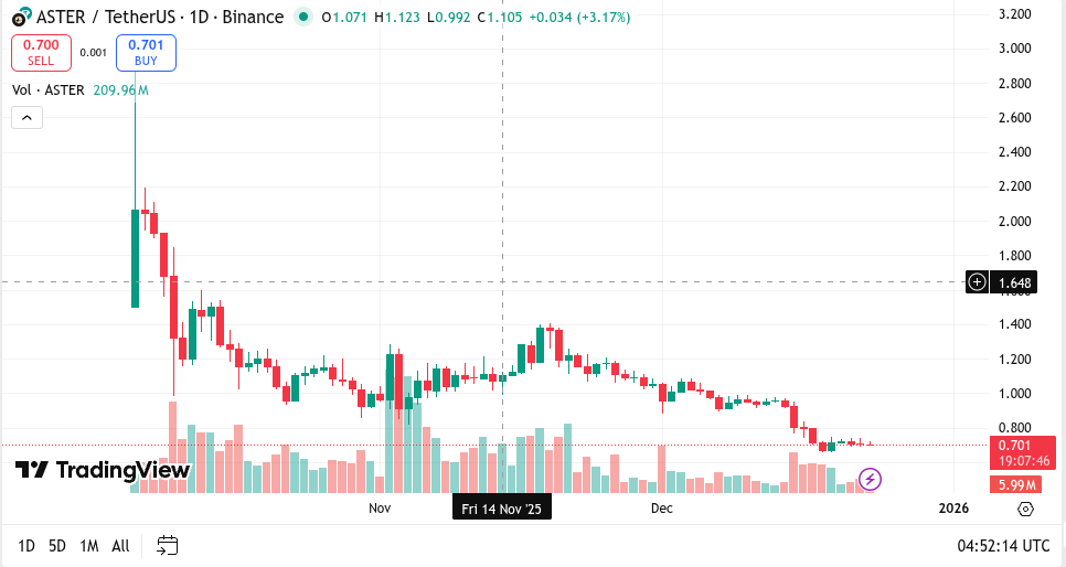 Terlepas dari pengumuman tersebut, harga ASTER belum merespons positif. Token saat ini diperdagangkan mendekati $0,70 dan turun sekitar 40% sejak akhir November.