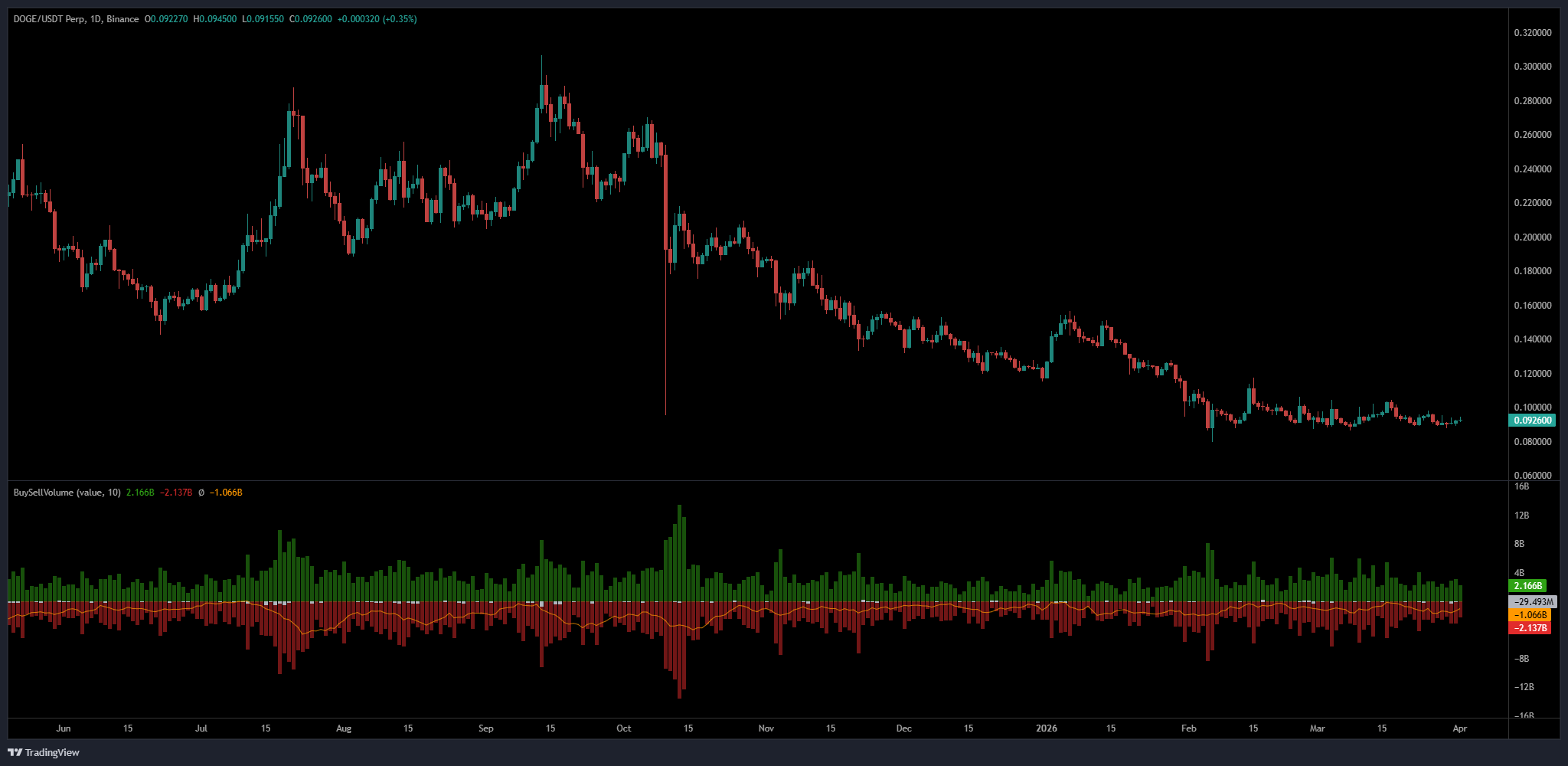 Grafik Coinalyze menunjukkan perdagangan DOGE/USDT di dekat $0,0926. Struktur harian yang lebih luas masih menunjukkan penurunan panjang dari tertinggi 2025 di atas $0,20 dan mendekati $0,30 pada puncaknya. Harga telah menghabiskan berbulan-bulan tren lebih rendah sebelum mendatar ke kisaran sempit di dekat level saat ini.