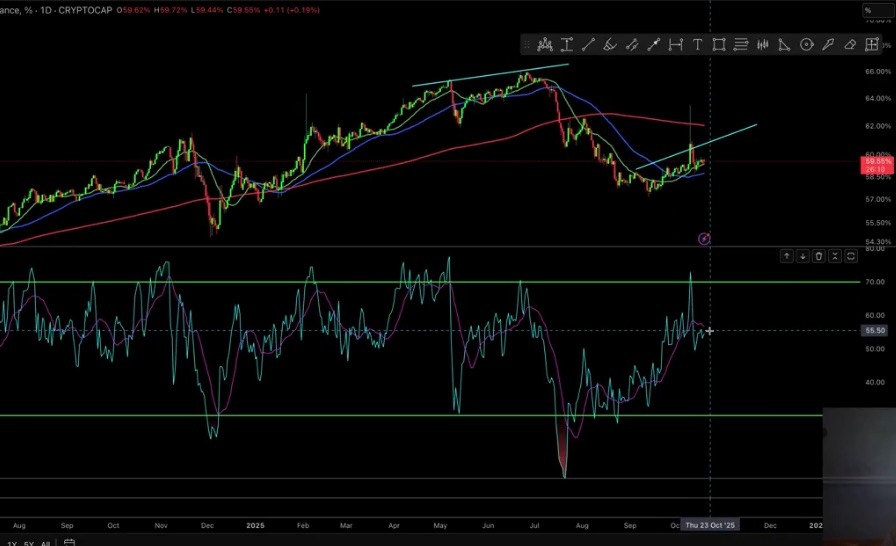 Namun, Gambardello mencatat bahwa dominasi Bitcoin berada di puncak pembalikan makro, sehingga membuka jalan bagi altseason dalam beberapa bulan mendatang. Lebih lanjut, Gambardello mencatat bahwa Relative Strength Index (RSI) harian dari Dominasi Bitcoin telah jatuh di bawah Moving Average-nya, menandakan sentimen bearishnya.