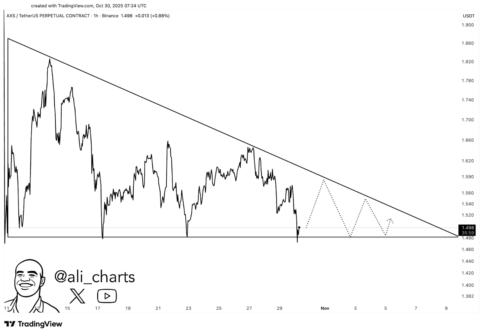 Grafik Martinez menunjukkan pasangan AXS/USDT bergerak dalam kisaran yang menyempit sejak pertengahan Oktober. Token ini telah membentuk level tertinggi yang lebih rendah sambil mempertahankan support stabil di sekitar $1,48. Martinez mengomentari X: “Axie Infinity AXS berkonsolidasi dalam segitiga, menandakan potensi pergerakan harga 20% ke depan.”