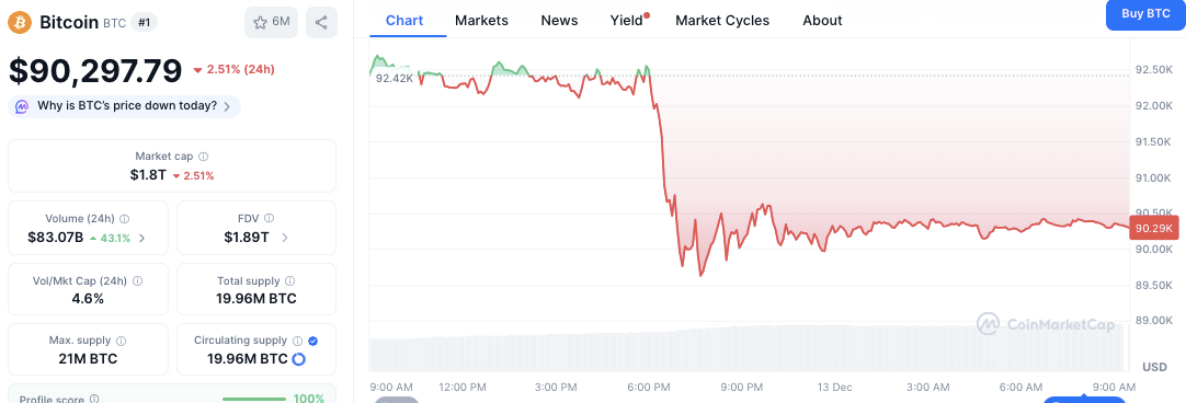 Bitcoin mengalami tekanan jangka pendek baru selama 24 jam terakhir, turun sekitar 2,5% menjadi sekitar $90.300. Data grafik menunjukkan harga bergerak menyamping mendekati $92.400 untuk sebagian besar sesi sebelum aksi jual terlambat mendorong Bitcoin sebentar di bawah $90.000. Aktivitas perdagangan meningkat selama penurunan, dengan volume 24 jam sebesar $83 miliar.