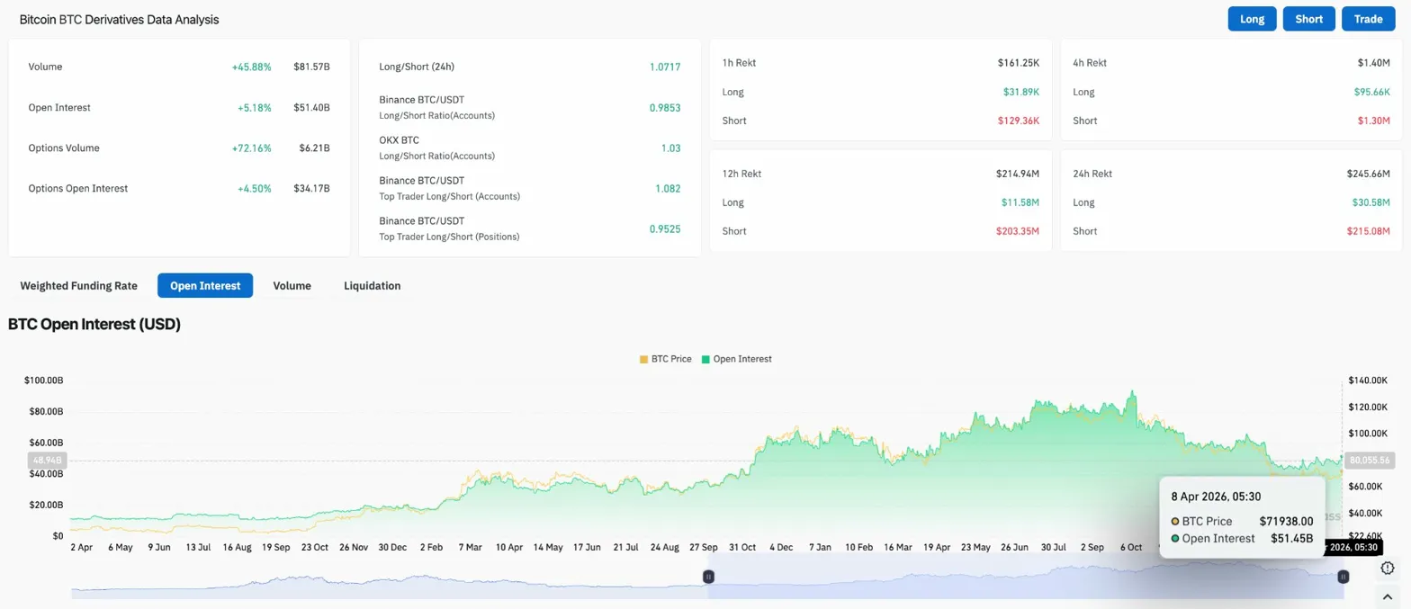 Rasio long/short 24 jam berada di 1.0717, sedikit long. Selama 24 jam, short kehilangan $215,08 juta dalam likuidasi dibandingkan hanya $30,58 juta untuk posisi long. Rasio 7 banding 1 itu menegaskan langkah gencatan senjata adalah tekanan singkat yang nyata. Data 12 jam menceritakan kisah yang sama, dengan $203,35 juta dalam likuidasi pendek versus $11,58 juta untuk posisi long. Penjual terjebak parah dalam hal ini, dan OI di $51,40 miliar masih memiliki ruang untuk tumbuh dibandingkan dengan puncak $80 miliar+ dari akhir 2024.