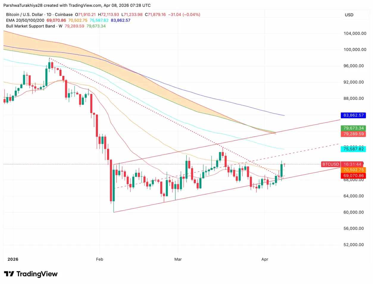 BTC diperdagangkan pada $ 71.879 pada 8 April, sedikit mundur dari level tertinggi tiga minggu di $ 72.738 setelah AS dan Iran menyetujui gencatan senjata selama dua minggu. Keempat EMA masih miring ke bawah di atas kepala, dengan 20 hari di $ 69.070 satu-satunya yang direklamasi sejauh ini.
