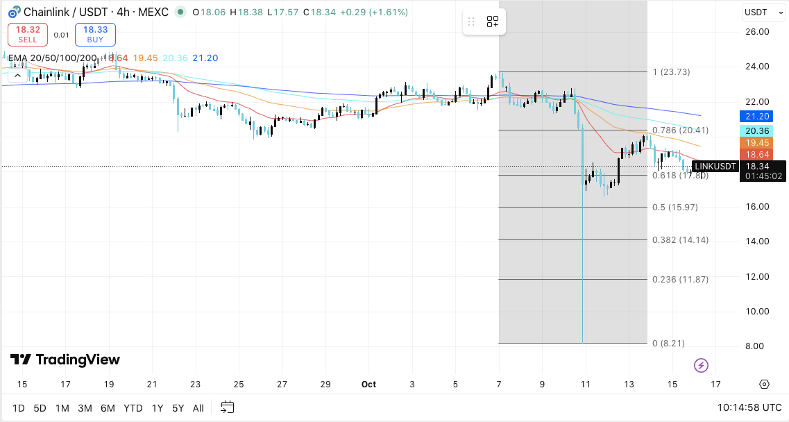 Pada waktu pers, LINK diperdagangkan di dekat $18,34 setelah sedikit pulih dari zona $17,80. Level ini sejalan dengan 0.618 Fibonacci retracement dari $8.21 ke $23.73 swing, wilayah yang sering bertindak sebagai titik balik selama fase korektif.