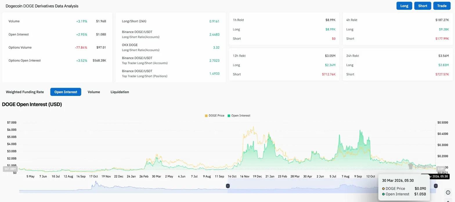 Terlepas dari kemiringan itu, posisi beli menyerap $2,83 juta dalam likuidasi selama 24 jam dibandingkan $727,57 ribu untuk shorts. Bulls diposisikan secara agresif tetapi terus terguncang di dekat $0,0950. OI pada $1,05 miliar adalah sebagian kecil dari $5 miliar hingga $6 miliar yang terlihat pada puncak akhir 2025, yang berarti ada ruang yang signifikan bagi leverage untuk menumpuk dengan cepat jika tekanan pita terselesaikan ke atas.