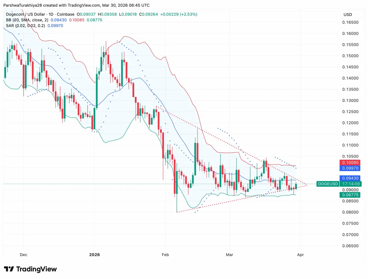 Dogecoin telah terikat kisaran antara $0,09 dan $0,15 selama kira-kira setahun, menurut Motley Fool, dan grafik harian mencerminkan persis itu. DOGE duduk di $0,0926 pada 30 Maret, dekat Bollinger Band yang lebih rendah karena banda memampatkan ke kisaran terketat sejak Januari. X Money diluncurkan bulan depan, dan sementara peluncuran awal hanya fiat, spekulasi kripto seputar Dogecoin sudah berkembang.