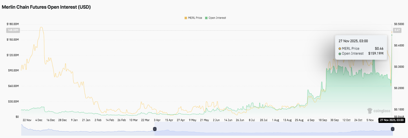 Pasar berjangka MERL menunjukkan keterlibatan yang lebih kuat karena minat terbuka berkembang hingga November. Totalnya mencapai sekitar $159 juta pada 27 November. Tren ini menyoroti peningkatan posisi leverage setelah berbulan-bulan partisipasi rendah.