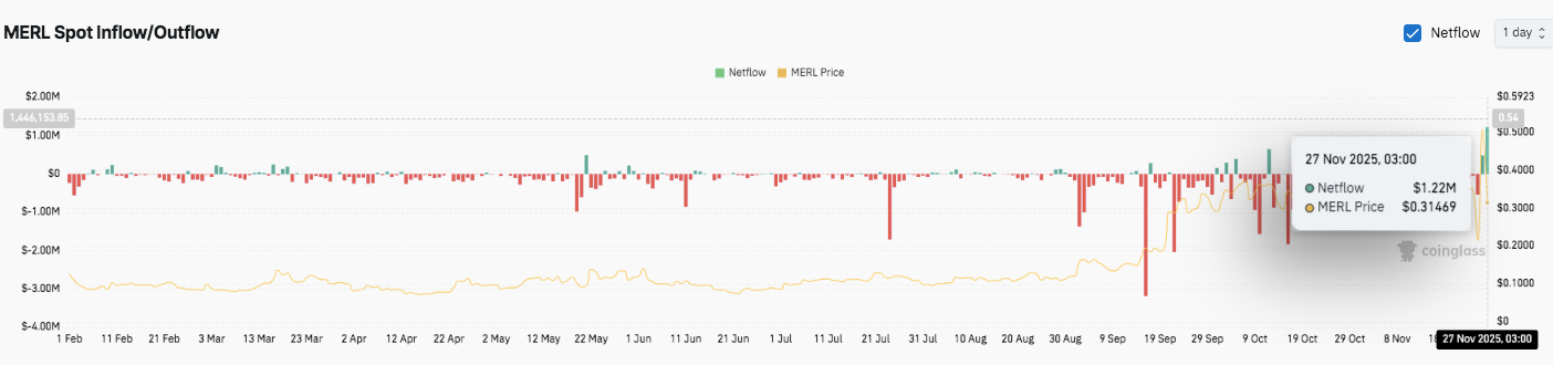 Arus masuk dan keluar spot MERL menunjukkan perubahan yang signifikan. Pasar melihat arus keluar yang konsisten selama beberapa bulan karena tekanan jual mendominasi. Tren itu melemah pada bulan November karena arus masuk muncul lebih sering.