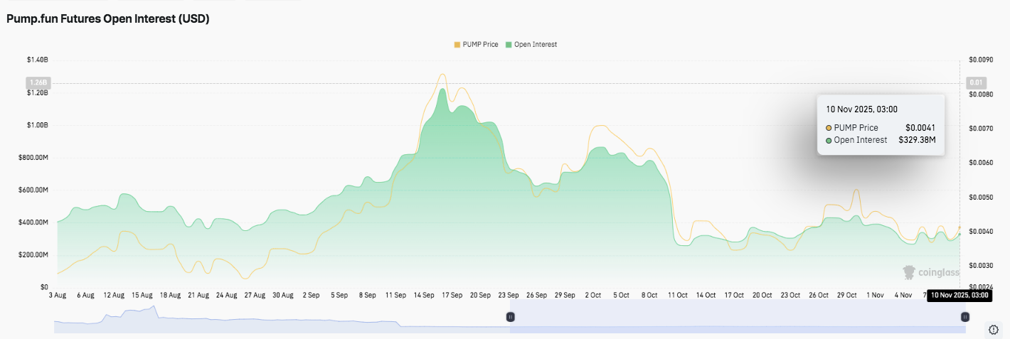 Data bunga terbuka untuk Pump.fun berjangka melukiskan gambaran yang hati-hati. Setelah mencapai puncaknya mendekati $ 1,26 miliar pada pertengahan September, telah turun menjadi sekitar $ 329 juta pada 10 November. Penurunan yang stabil ini mencerminkan retracement harga token, menandakan berkurangnya selera spekulatif dan pergeseran ke arah sentimen netral.