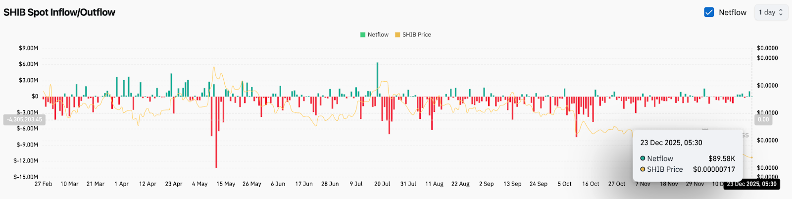 Pembacaan terbaru SHIB menunjukkan sekitar $89.000 dalam arus keluar bersih pada 23 Desember setelah $1 juta dalam arus masuk sehari sebelumnya.