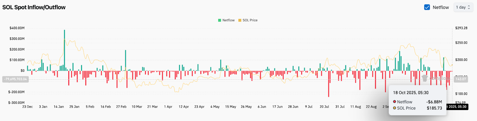 Data pertukaran dari Coinglass mengungkapkan bahwa Solana mencatat arus keluar bersih sebesar $6,88 juta pada 18 Oktober, salah satu yang terkecil dalam sesi terakhir. Moderasi arus keluar mengikuti seminggu penjualan besar-besaran, menunjukkan tekanan jual mulai mereda.