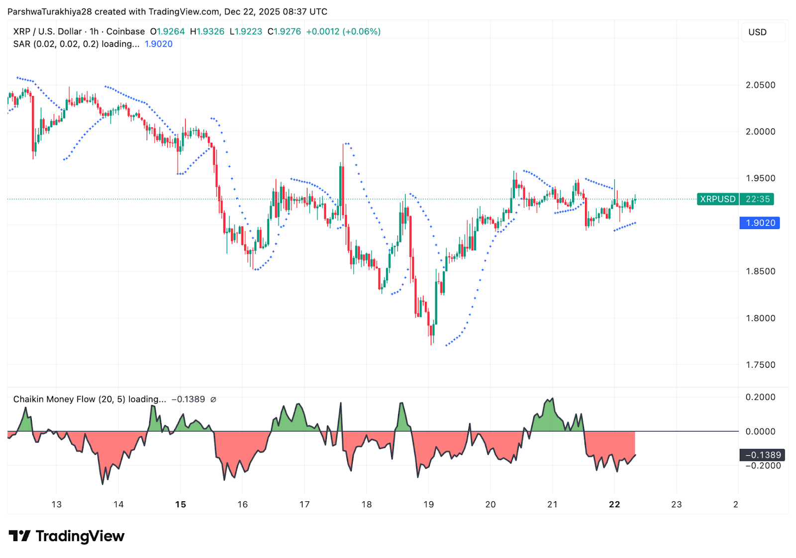 Pada grafik 1 jam, XRP berusaha untuk mendasarkan di atas level $1.90 setelah rebound dari level terendah baru-baru ini di dekat $1.78. Titik SAR parabola telah terbalik di bawah harga, menunjukkan stabilisasi jangka pendek daripada momentum penurunan yang diperbarui.