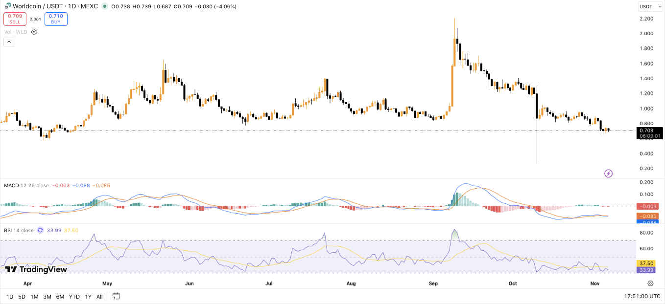 Sementara penggunaan jaringan telah melonjak, token asli Worldcoin, WLD, menghadapi tekanan jual baru. Token saat ini diperdagangkan pada $0,705, turun 9,27% minggu ini. Itu tergelincir dari tertinggi $0,86 ke level terendah di dekat $0,68, mencerminkan tren bearish yang terus-menerus. Penurunan 42% dalam volume perdagangan semakin menunjukkan pasar yang mendingin, dengan lebih sedikit peserta yang memasuki posisi.